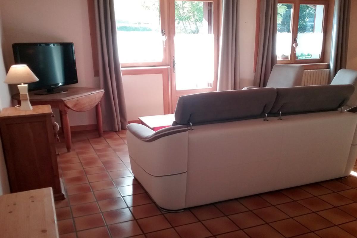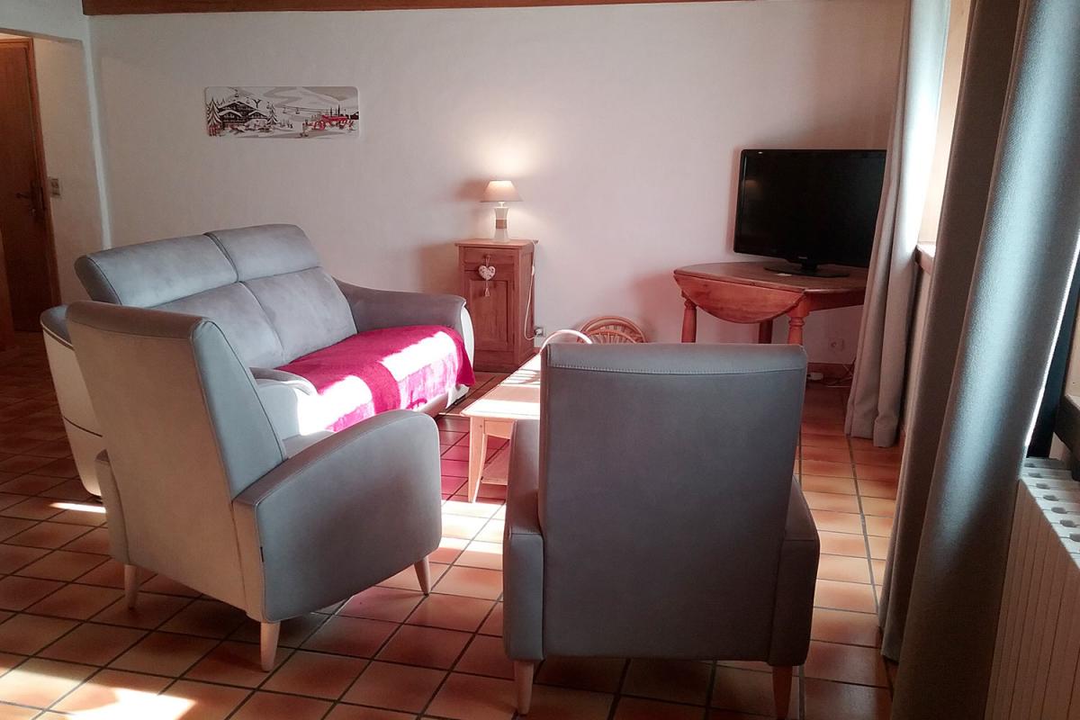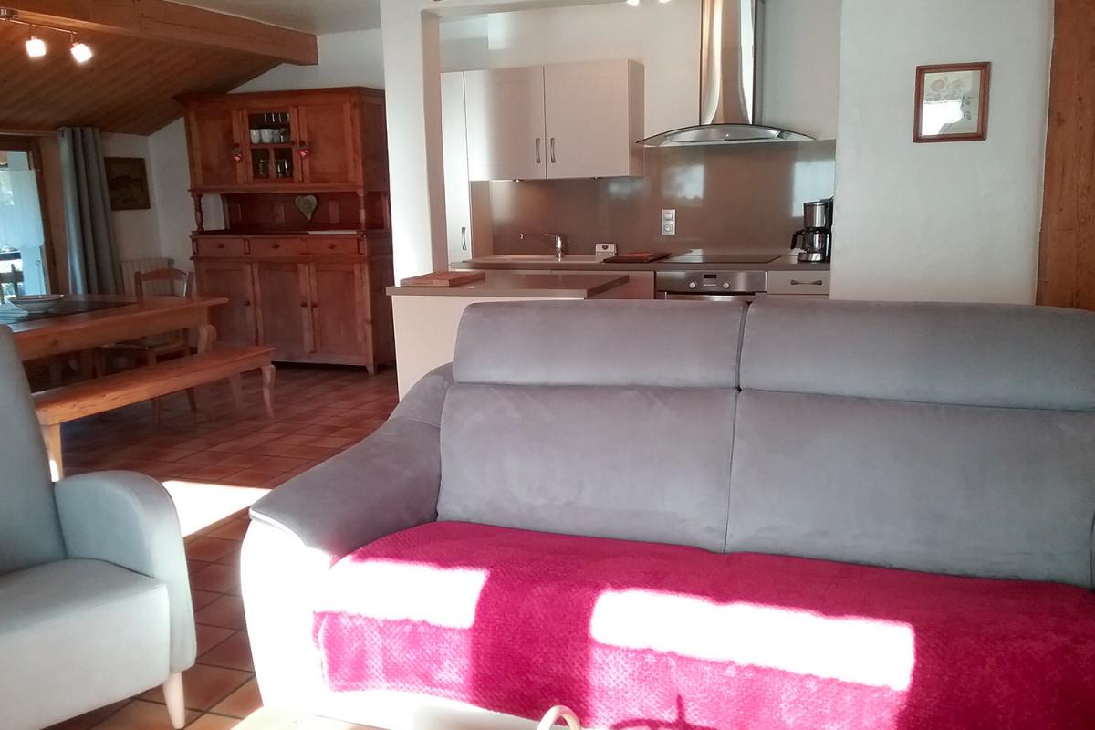 Espace à vivre : coin salon : canapé 3 places, 2 fauteuils 1 place, table basse, télévision, BZ en 140x190 (couverture et 2 oreillers)